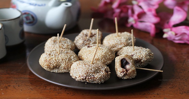- Give the coated dumplings a last roll between the palms to make the sesame seeds adhere well to the dough. This also helps remove excess sesame seeds. Place on a plate and cover with plastic wrap.